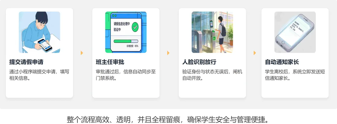 智能出入管理:学生线上请假,审批通过后自动同步门禁系统,人脸识别/扫码出入,离校实时通知家长