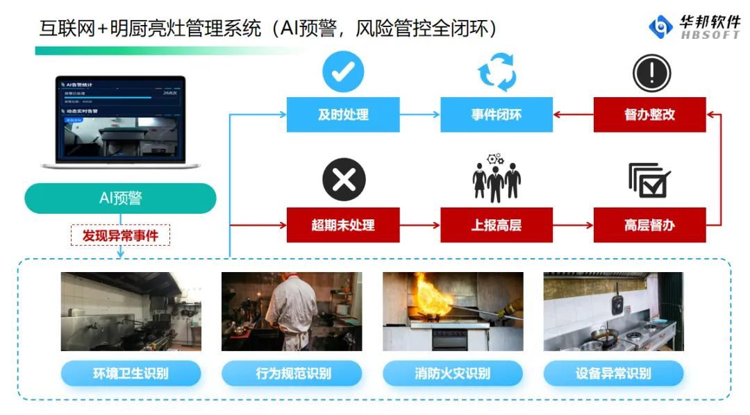 食材管理系统主要为食材采购流程、食材使用管理、供应商家管理提供技术支撑,“互联网+明厨亮灶”是借助视频监控、互联网、物联传感、AI 图像识别等技术手段,将餐饮服务全过程展示给消费者与监管部门,以保障食品安全。主管部门通过平台实现远程监管、目标性监管,最终实现餐饮服务食品安全社会共治管理。