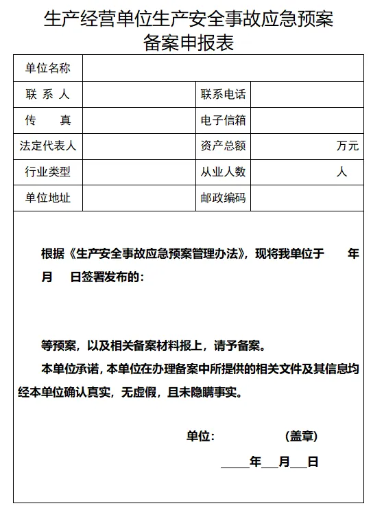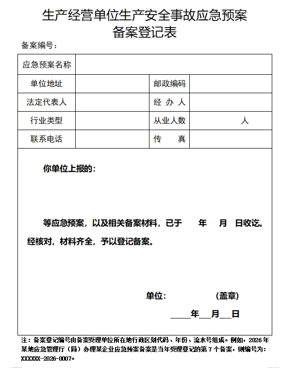 为落实《生产安全事故应急条例》(国务院令第708号)、《国务院办公厅关于印发〈突发事件应急预案管理办法〉的通知》(国办发〔2024〕5号)和《应急管理部关于修改〈生产安全事故应急预案管理办法〉的决定》(应急管理部令第2号)等有关要求,进一步加强和规范生产安全事故应急预案备案办理工作,应急管理部制定了《生产经营单位生产安全事故应急预案备案申报表》《生产经营单位生产安全事故应急预案备案登记表》,现予印发。