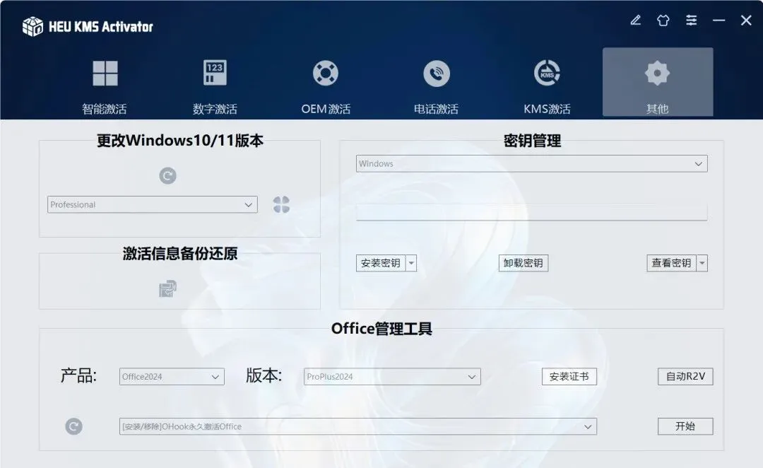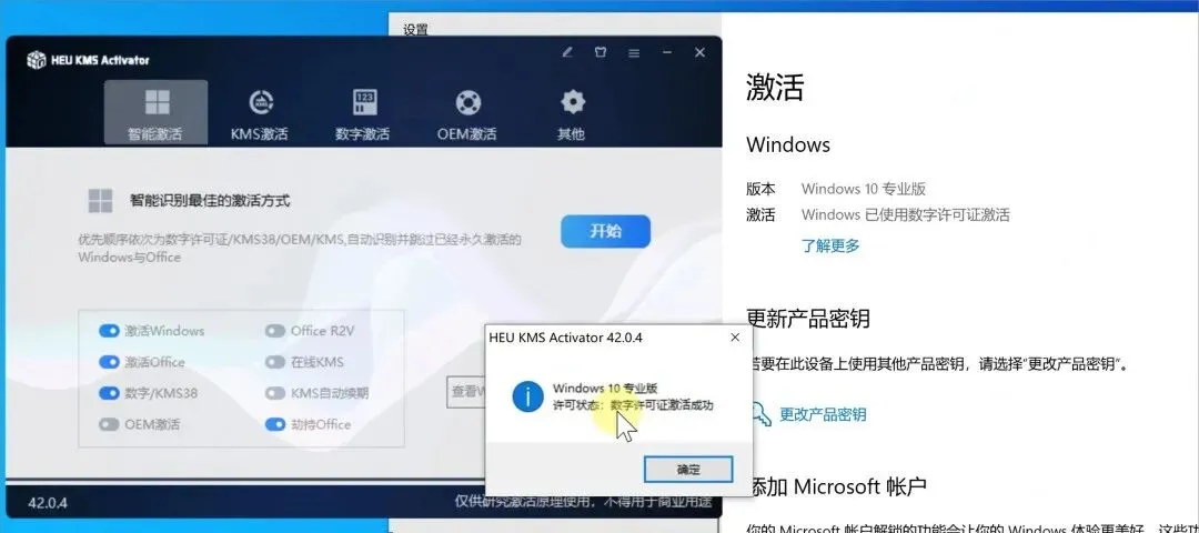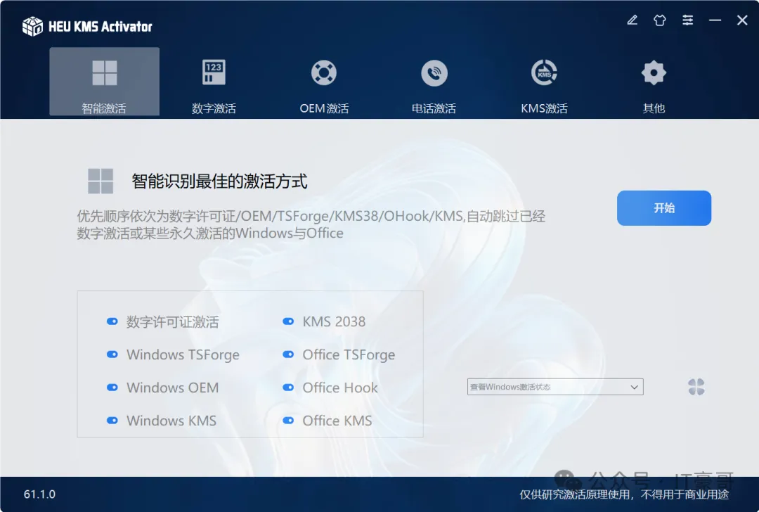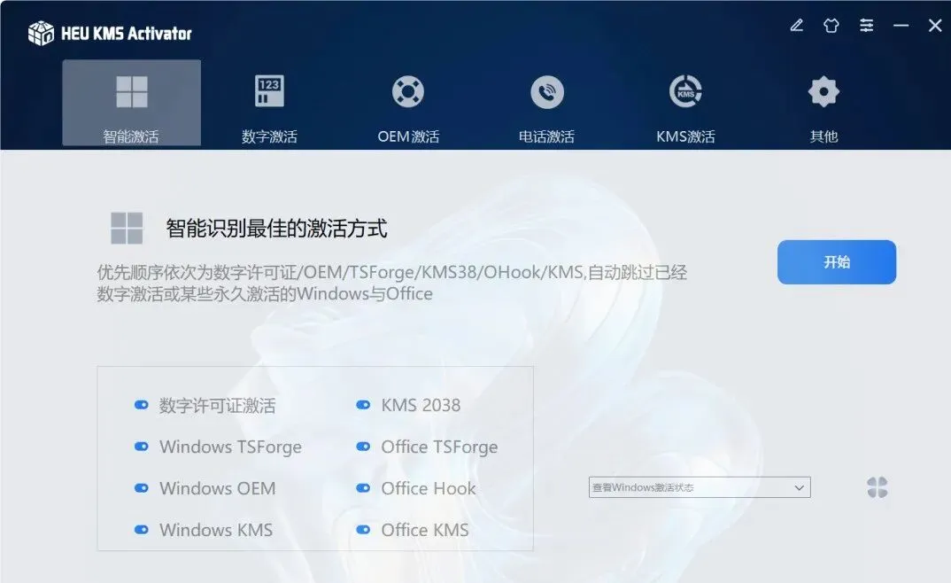 启动“开始”,启动 Windows 及 Office,自动识别人优化的激活途径