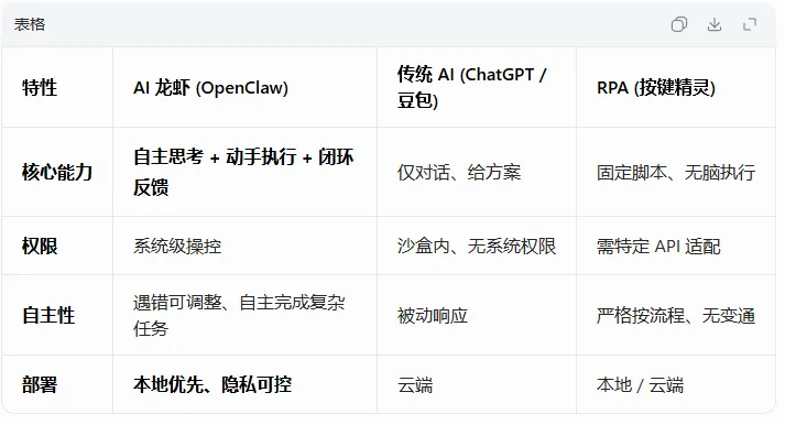 AI 龙虾 = 会自己干活的数字员工。它是 AI 从 “动口” 到 “动手” 的里程碑,但高权限 = 高风险,普通人 “养虾” 务必谨慎。
