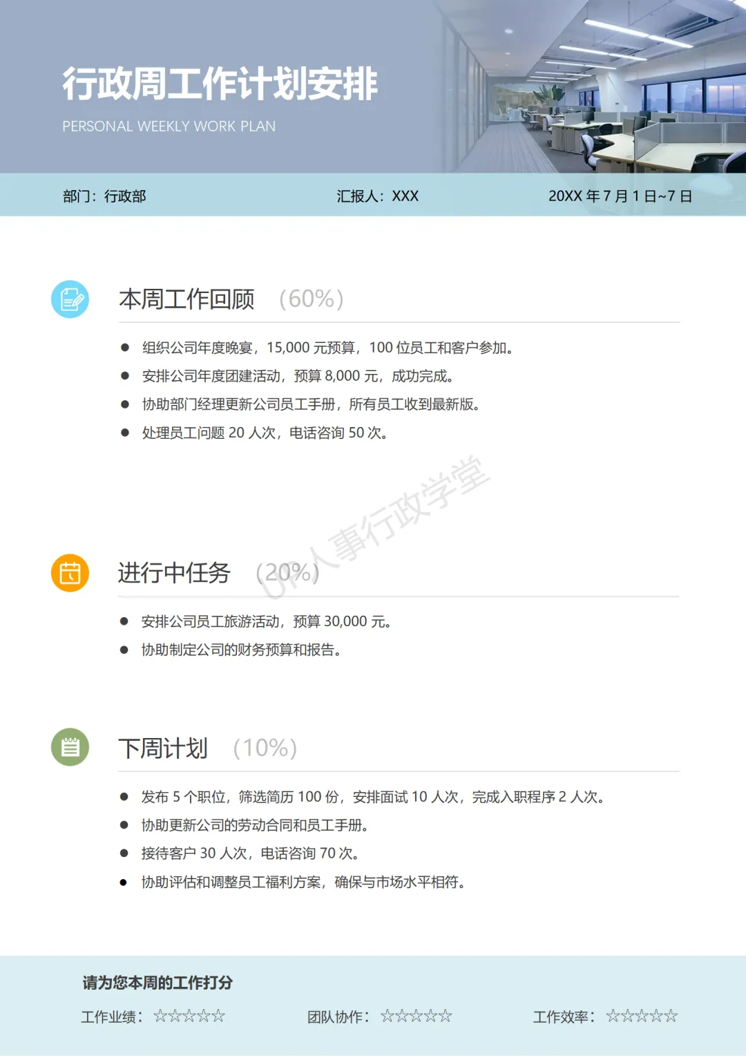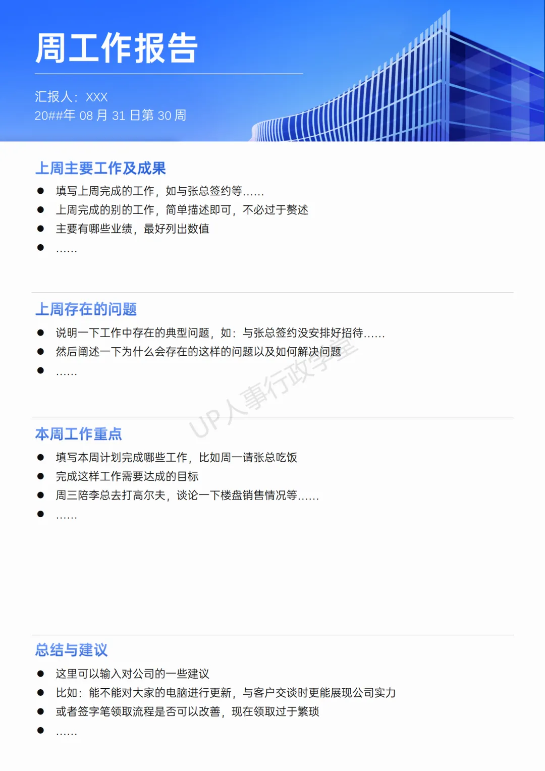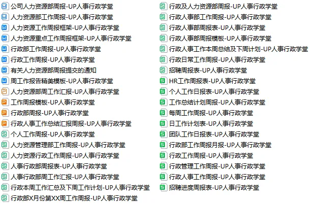《行政人事周报》资料包内含37份人力资源与行政工作周报框架模板。