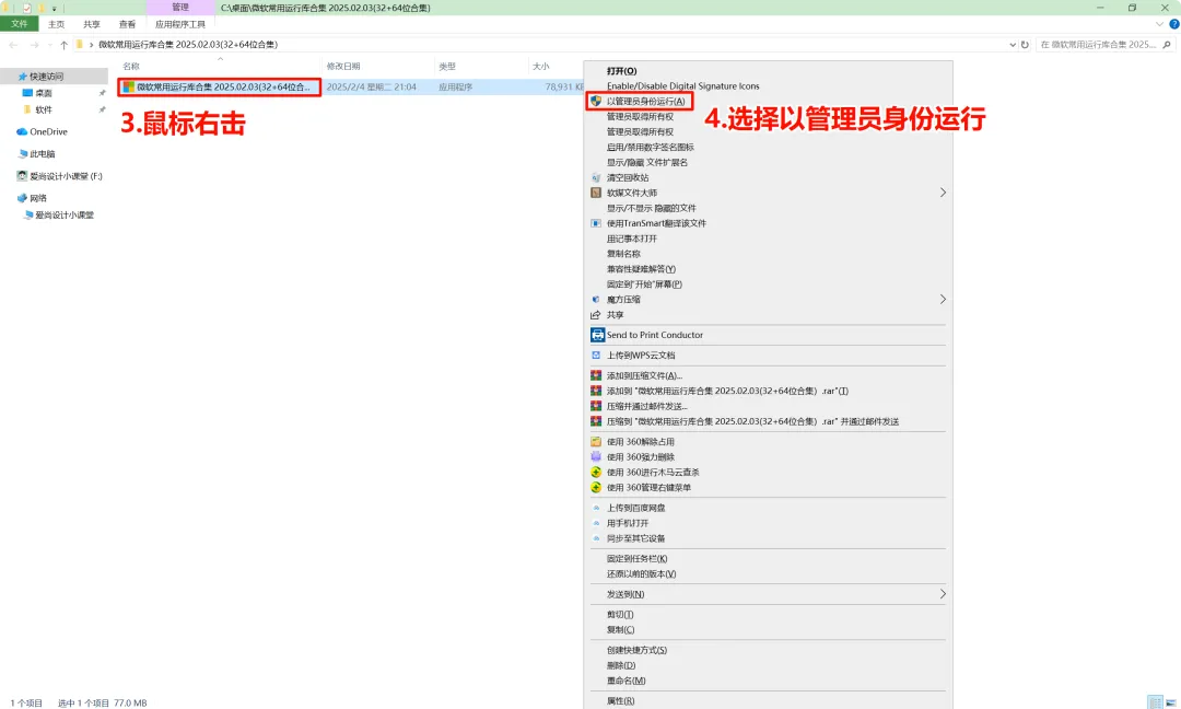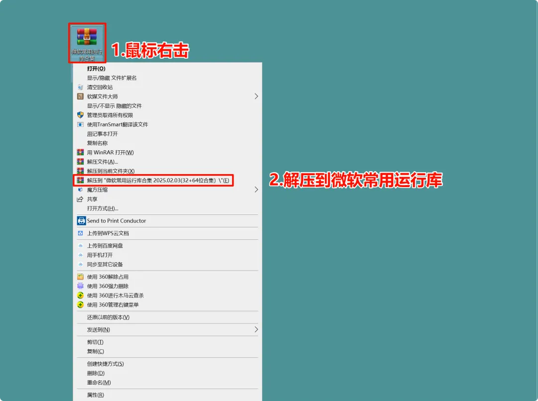 解压安装包:1.鼠标右击【微软常用运行库合集】压缩包。2.选择电脑上安装的解压软件(如:WinRAR)点击【微软常用运行库合集】。