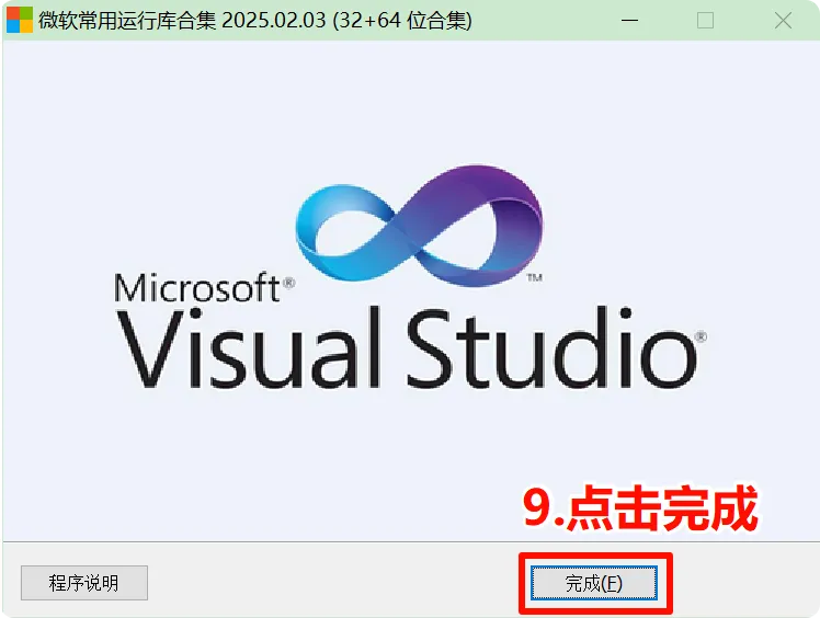 12. 安装完成后,点击“完成”,重启电脑(重要!只有重启后,所有组件才能生效,避免安装后仍报错)。
