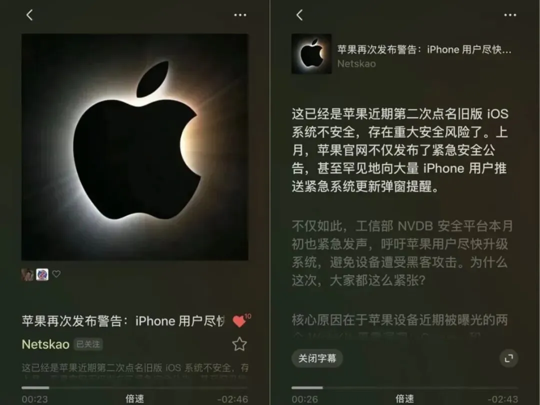 3️⃣、本次更新优化了公众号展示样式,文章封面回归大图模式,下滑可显示公众号头像与名称,听全文功能新增自动滚动字幕,阅读更便捷。