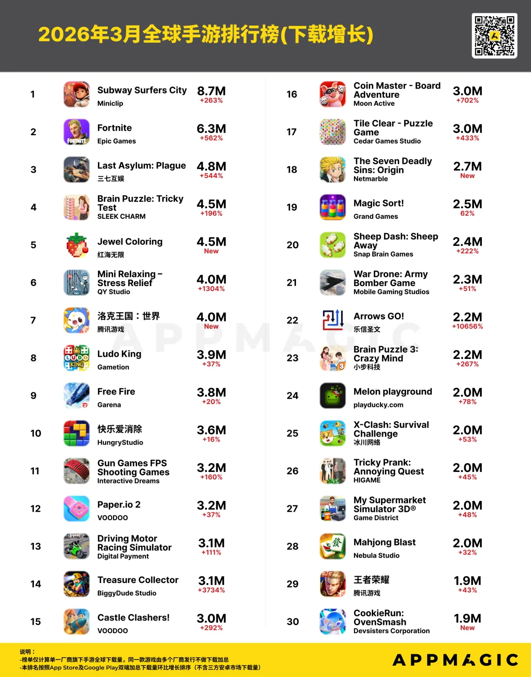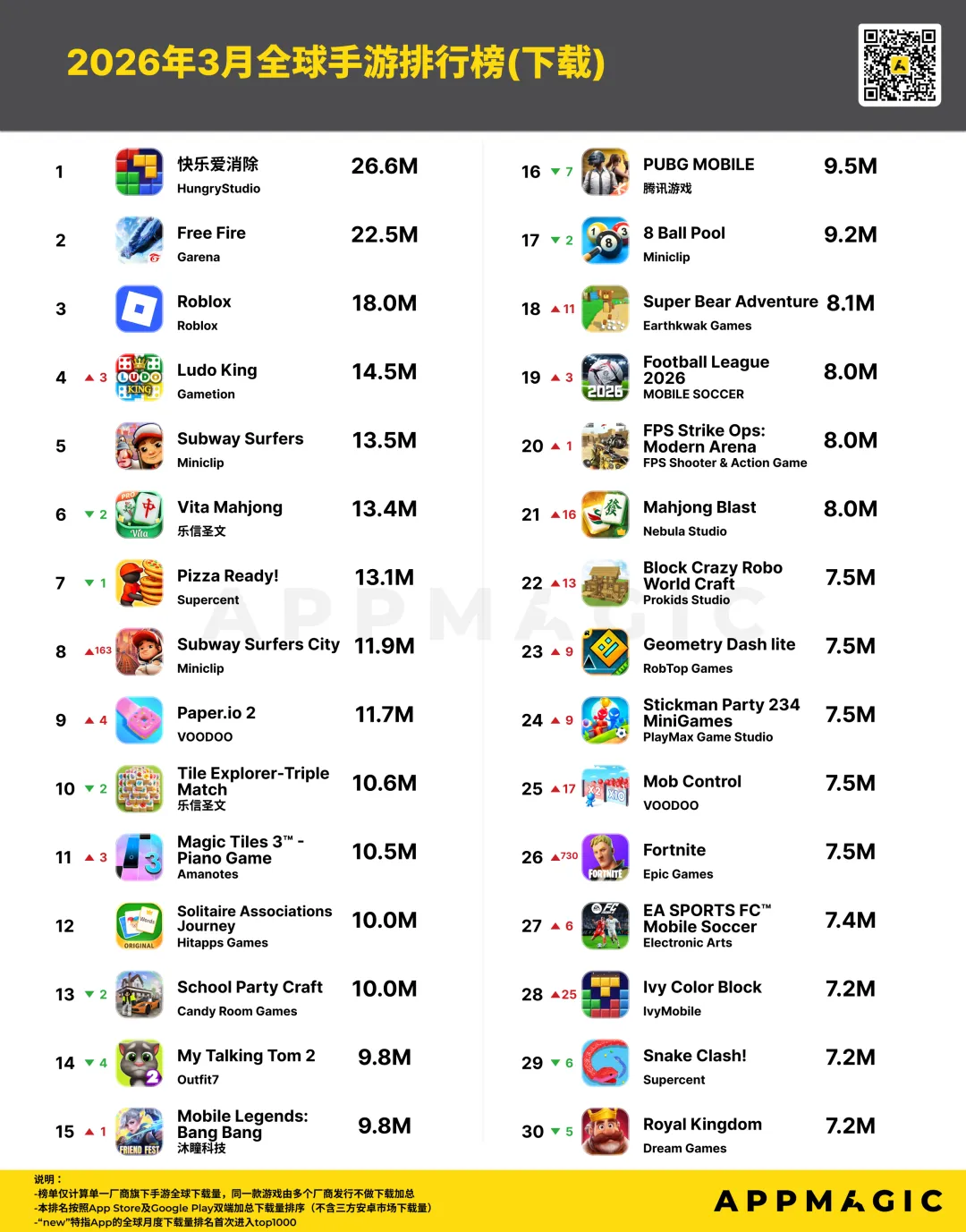 2026年3月全球手游下载排行与增长榜AppMagic发布2026年3月全球手游下载排行与增长榜!3月全球手游下载总量环比增长8.9%,同比2025年3月增长2.8%。