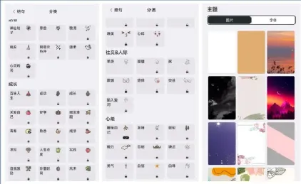 它提供了丰富的句子和励志文案,包括:治愈、成长、工作、学习、健康、艰难时刻、灵感、哲学、平静、社交等。