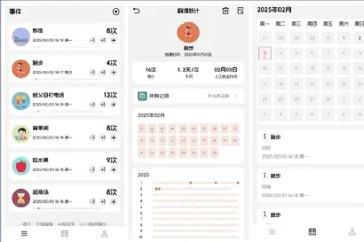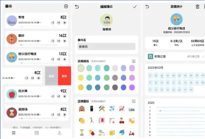 它支持强大的数据统计功能,支持时间顺序查看所有事件记录,支持时间分布图,支持展示事件累计次数、平均次数、上次发生的时间,还支持日历视图展示每天做的所有事情。