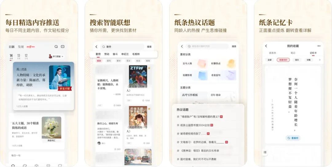 每日更新各类作文素材,如时事热点、人物素材、写作模板、开头结尾金句等,配有详细的解析和示例,一看就能用。