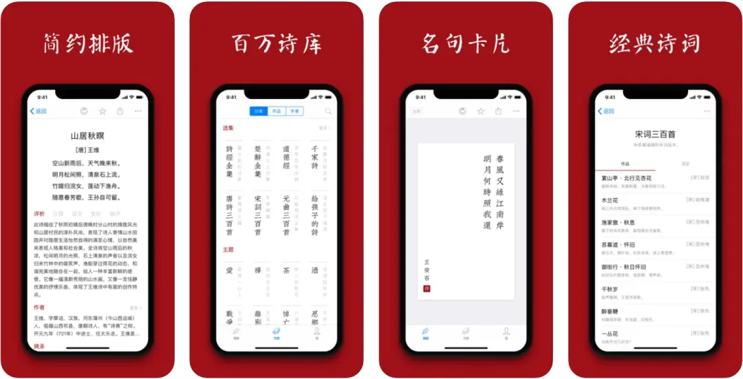 虽然每个卡片只有短短的两句诗,但古韵味十足,而且点击这些卡片就能看到整首诗,每首诗都有赏析、注释和译文,完全不用担心看不懂!