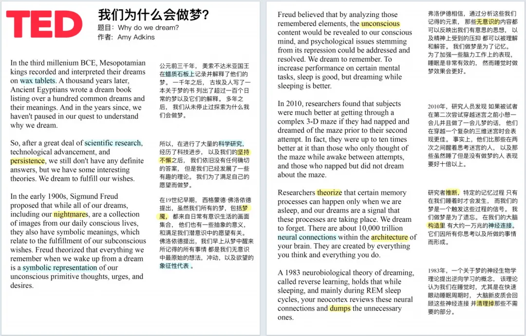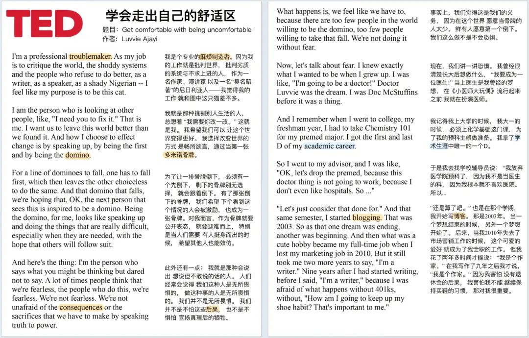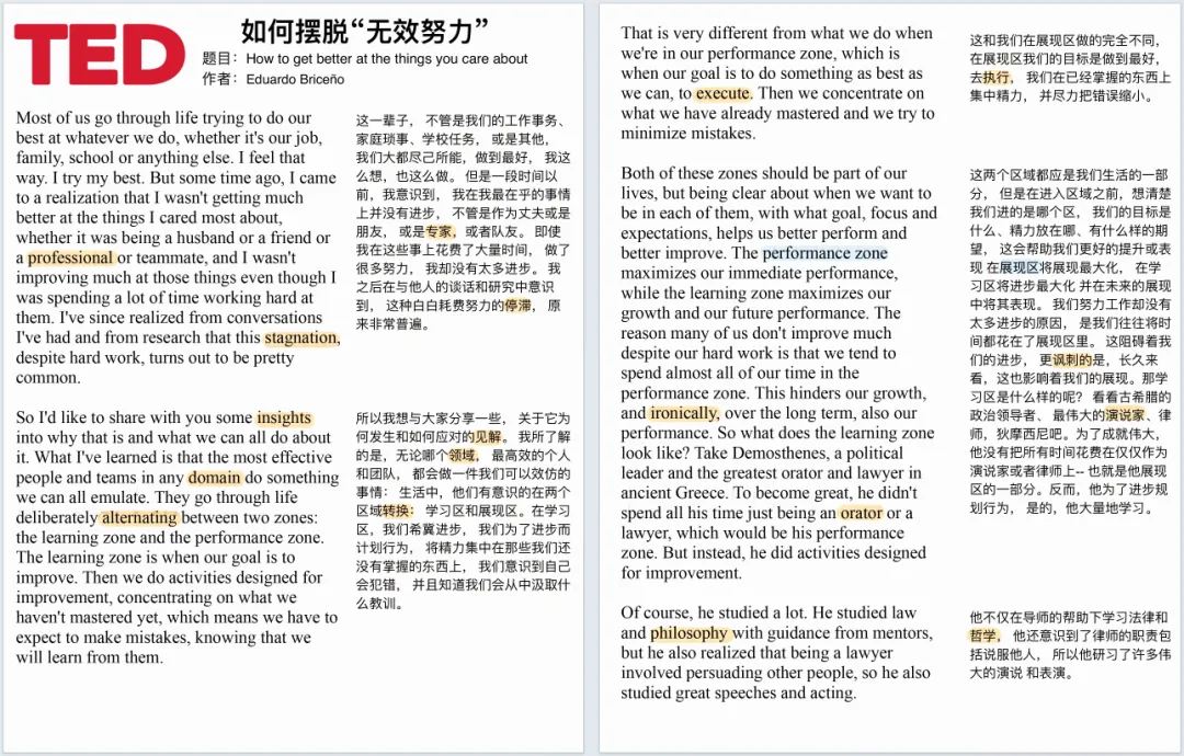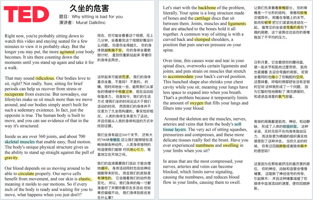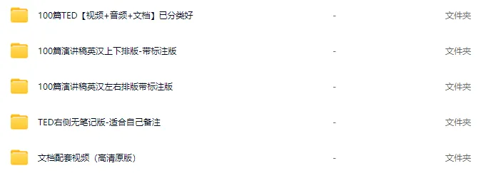 100篇TED英文演讲+笔记(可下载),英语口语、听力绝佳神器!今天给大家分享100部精选TED演讲资源,包含视频、音频,以及超超超好用的演讲稿笔记,除了英文原文,还有中文翻译和重点词汇注解,节省了大量自己做笔记、查字典的时间。高清视频,中英双语字幕 每个视频均有配套演讲稿,含有重点词汇解析。演讲稿对每一句话进行的对照翻译,并且标出了重点词汇及重点短语,重点讲解。学习TED演讲稿可以掌握非常地道的英语表达。资源截图如何获取电子打印版点击关注“英语学习宝藏”公众号▼后台回复关键字【英文演讲】即可免费领取(请及时下载)