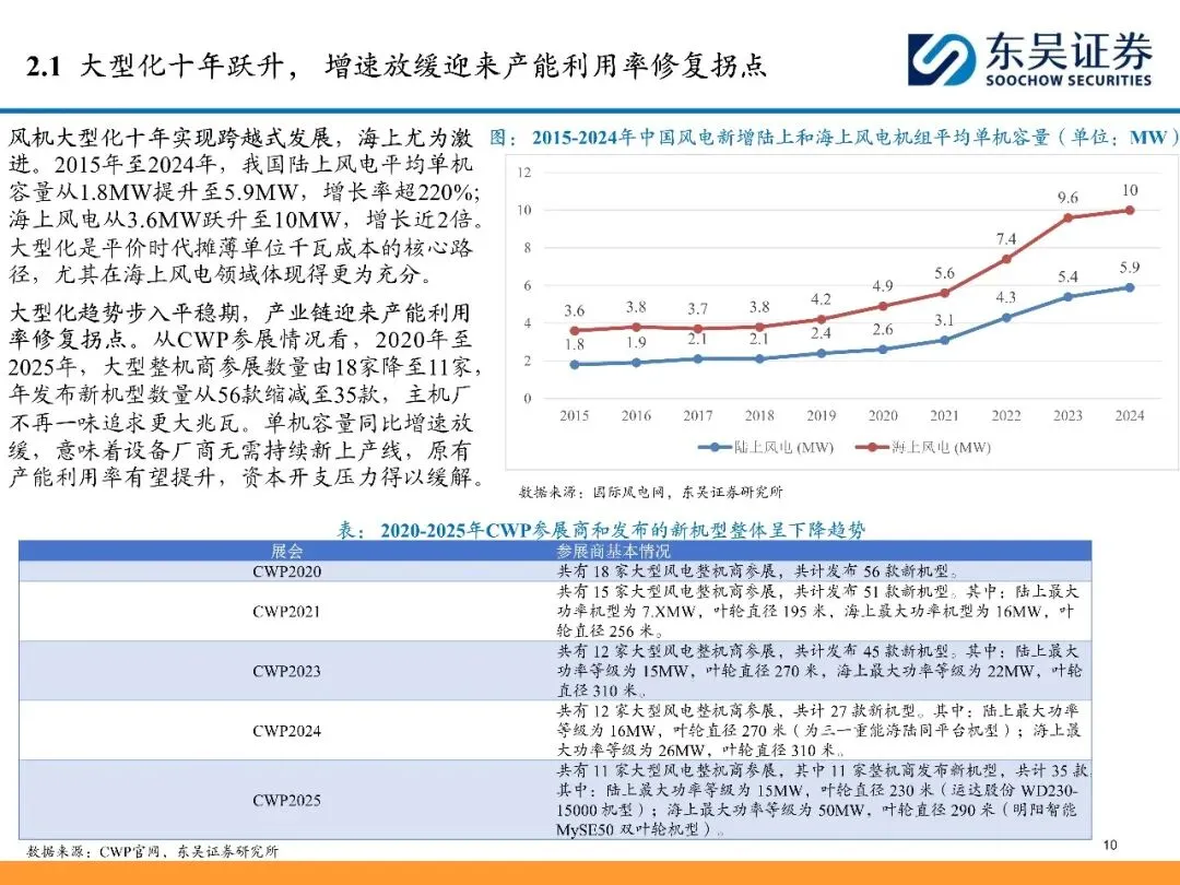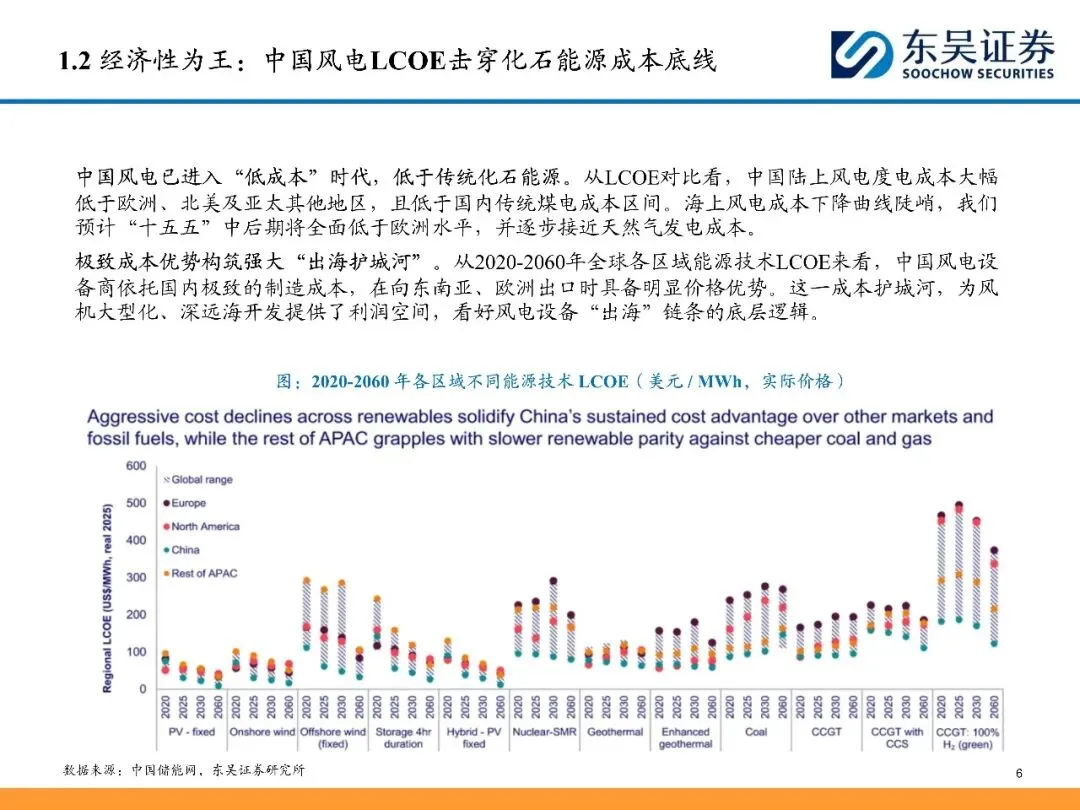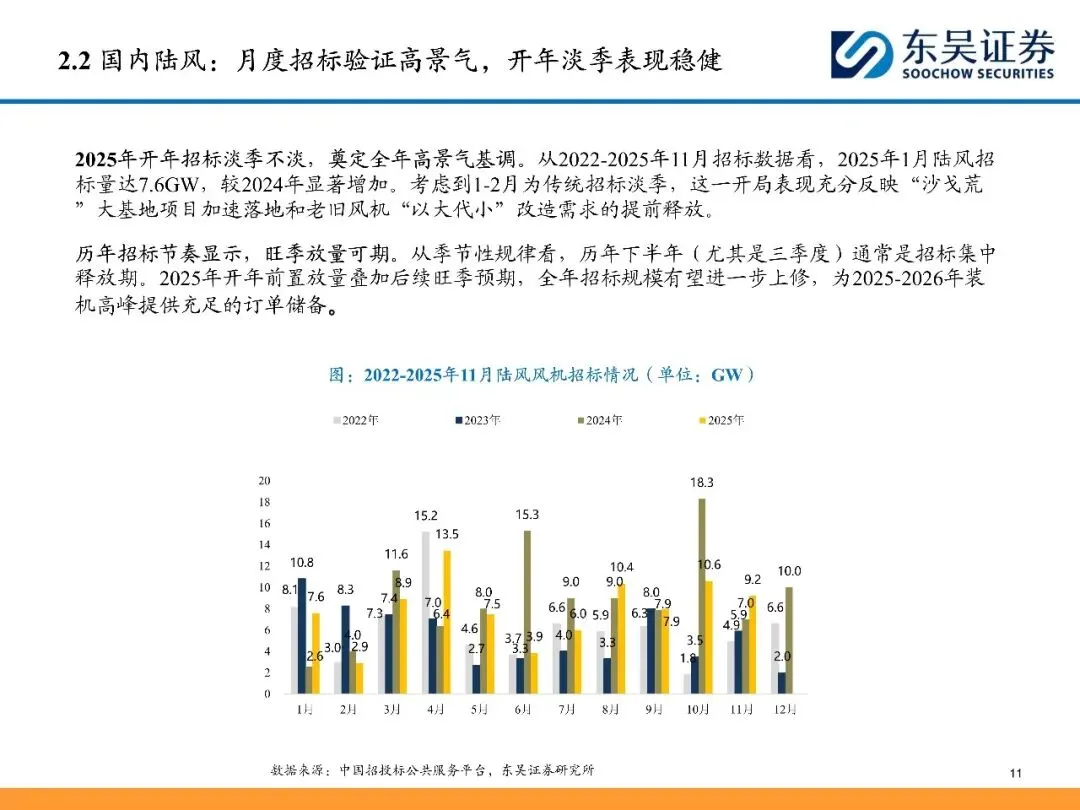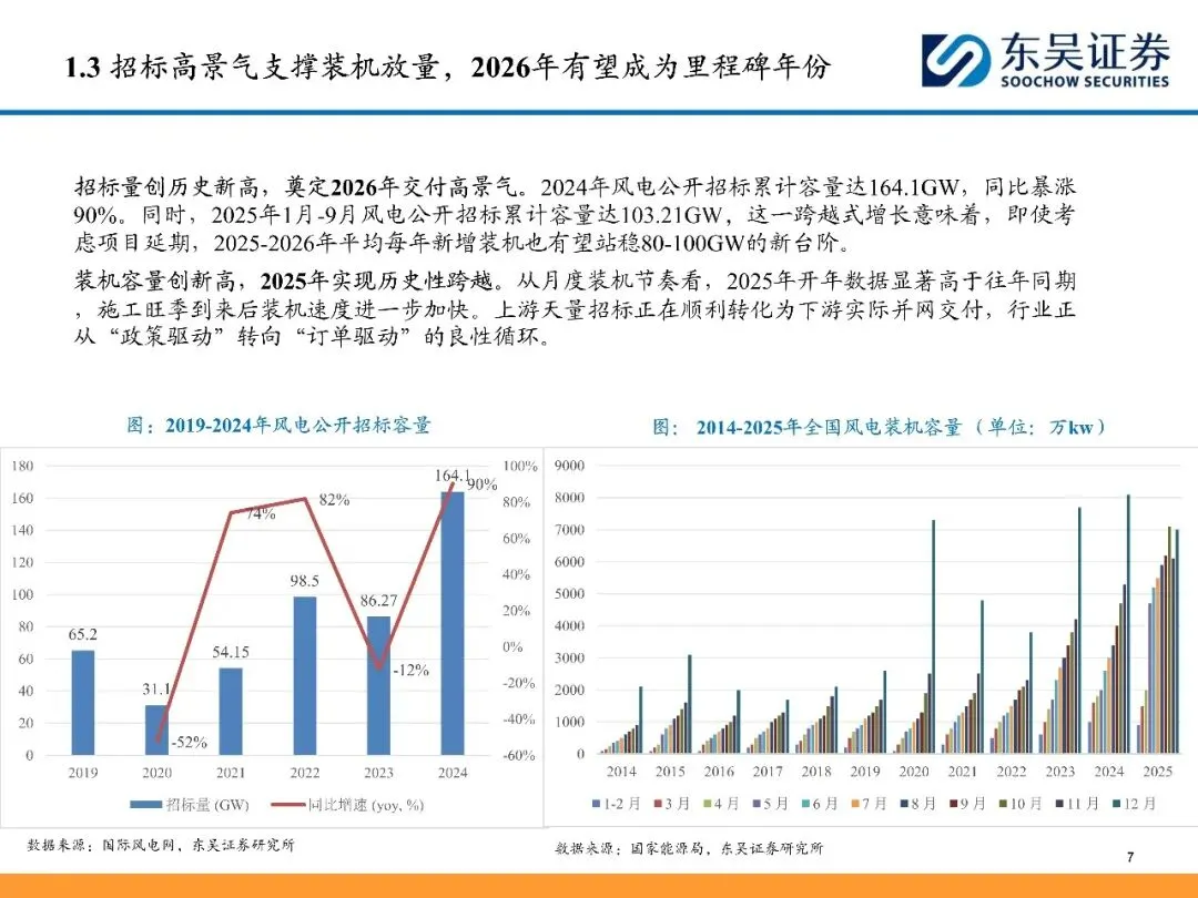 乘风起势:景气周期确立,风电迈入长期成长通道。风电在可再生能源体系中"压舱石"地位稳固,海上风电贡献度结构性提升。中国风电进入"低成本"时代,陆上与海上风电LCOE低于传统化石能源,成本优势构筑强大"出海护城河"。2025年1月-11月风电招标量创下117.97GW佳绩,莫定交付高景气。月度招标数据显示淡季不淡、旺季更旺",海风加速放量。需警惕原材料价格波动对盈利空间的挤压,同时大型化趋势放缓带来产能利用率修复拐点,装机容量选创新高,2026年有望成为里里程碑式年份。