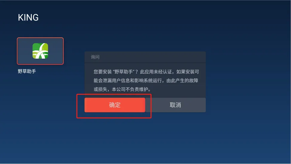 5.找到野草助手的安装包,点击安装。在确认弹窗中,点击【确定】。