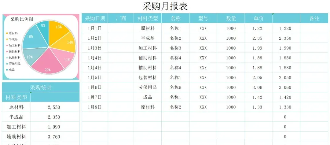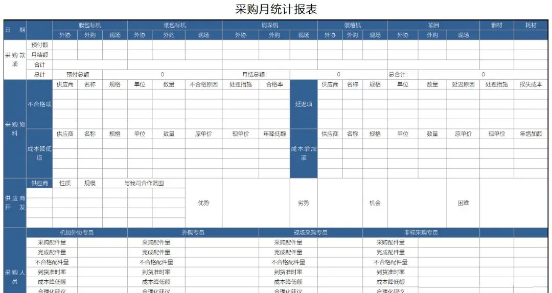 今天和大家分享的是采购订单,月报表方面的资料。采购月报表在企业中发挥着重要的作用,它不仅可以提供详细的采购数据和信息,还可以帮助企业分析采购成本、评估供应商绩效、识别采购流程问题、评估采购员绩效以及评估采购风险等。因此,企业应重视采购月报表的编制和分析工作,以更好地管理采购活动并提升企业的竞争力。