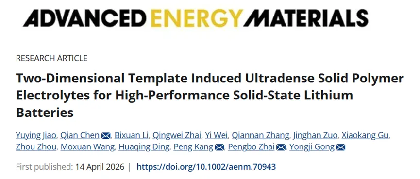 该成果以 “Two-Dimensional Template Induced Ultradense Solid Polymer Electrolytes for High-Performance Solid-State Lithium Batteries” 为题发表在 “Advanced Energy Materials” 期刊,第一作者是Jiao Yuying、Chen Qian。