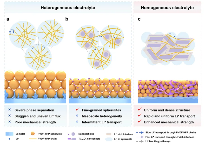 图 1 为不同模板对电解质结构与锂离子迁移性能影响的示意图,对比分析了纯聚偏氟乙烯 - 六氟丙烯电解质、纳米粒子增强型聚偏氟乙烯 - 六氟丙烯电解质、Ti₀.₈₇O₂纳米片诱导型聚偏氟乙烯 - 六氟丙烯电解质的相分离程度、结构均匀性与锂离子传输路径差异。