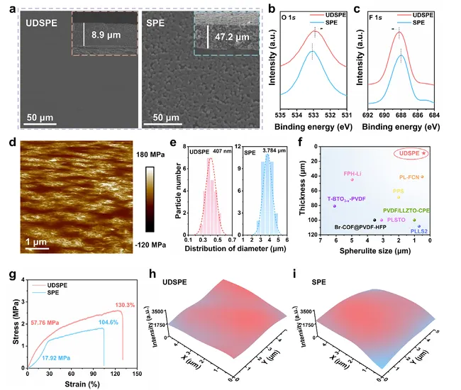 图 2 为电解质的各项表征结果图,包含超高致密固态聚合物电解质与纯固态聚合物电解质的表面及截面扫描电镜图像、X 射线光电子能谱图谱、原子力显微镜杨氏模量图像、球晶尺寸统计对比图、应力应变曲线以及双三氟甲磺酰亚胺锂的拉曼 mapping 图,直观呈现两类电解质的形貌、界面作用、力学性能与锂盐分布特征。