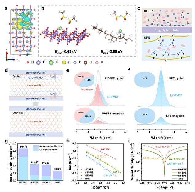 图 3 为电解质的离子传输行为表征图,通过差分电荷密度、锂盐解离能垒计算、锂离子传输示意图、锂同位素交换固态核磁共振图谱、离子电导率与迁移数数据、Arrhenius曲线以及塔菲尔曲线,揭示 Ti₀.₈₇O₂纳米片对锂离子传输的强化机制。