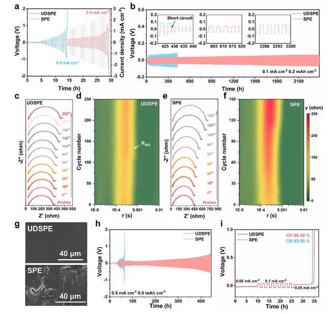 图 4 为聚合物电解质的电化学性能图,分析了锂对称电池的临界电流密度、恒流循环曲线、电化学阻抗谱与弛豫时间分布结果,以及锂电极镀锂后的扫描电镜图像、不同电流密度下的循环曲线和锂铜半电池的库仑效率数据,体现电解质的界面稳定性与锂枝晶抑制能力。