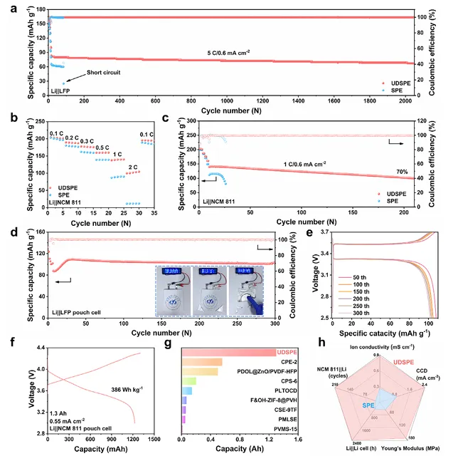 近日,北京航空航天大学宫勇吉、翟朋博、康鹏、ChenQian 团队采用带负电的 Ti₀.₈₇O₂单层纳米片作为互联模板,抑制聚偏氟乙烯 - 六氟丙烯基体的相分离,制备出结构超高致密的固态聚合物电解质 UDSPE;Ti₀.₈₇O₂纳米片与锂离子间的强相互作用可构建富锂界面实现锂离子快速迁移,使电解质室温离子电导率达 0.87 mS cm⁻¹,同时均匀分散的双三氟甲磺酰亚胺锂助力形成无机型固态电解质界面相,有效抑制界面副反应、提升界面稳定性;该电解质使锂对称电池实现 2300 小时稳定循环,锂 / 磷酸铁锂全电池超 2000 次稳定循环,还可组装出无液态添加、能量密度达 386 Wh kg⁻¹ 的安时级固态软包电池,为高性能固态锂金属电池用均相聚合物电解质设计提供了可行思路。