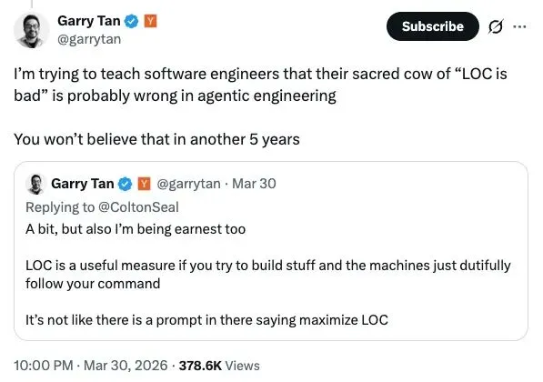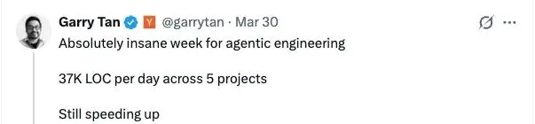“同时推进 5 个项目,现在平均一天能产出 3.7 万行代码...... 我最近一直在试着让软件工程师接受一件事:你们一直奉为圭臬的那句‘代码行数没意义’,到了 agentic engineering 时代,可能没那么对了。再过 5 年,你们大概不会相信自己当年真这么想过。”