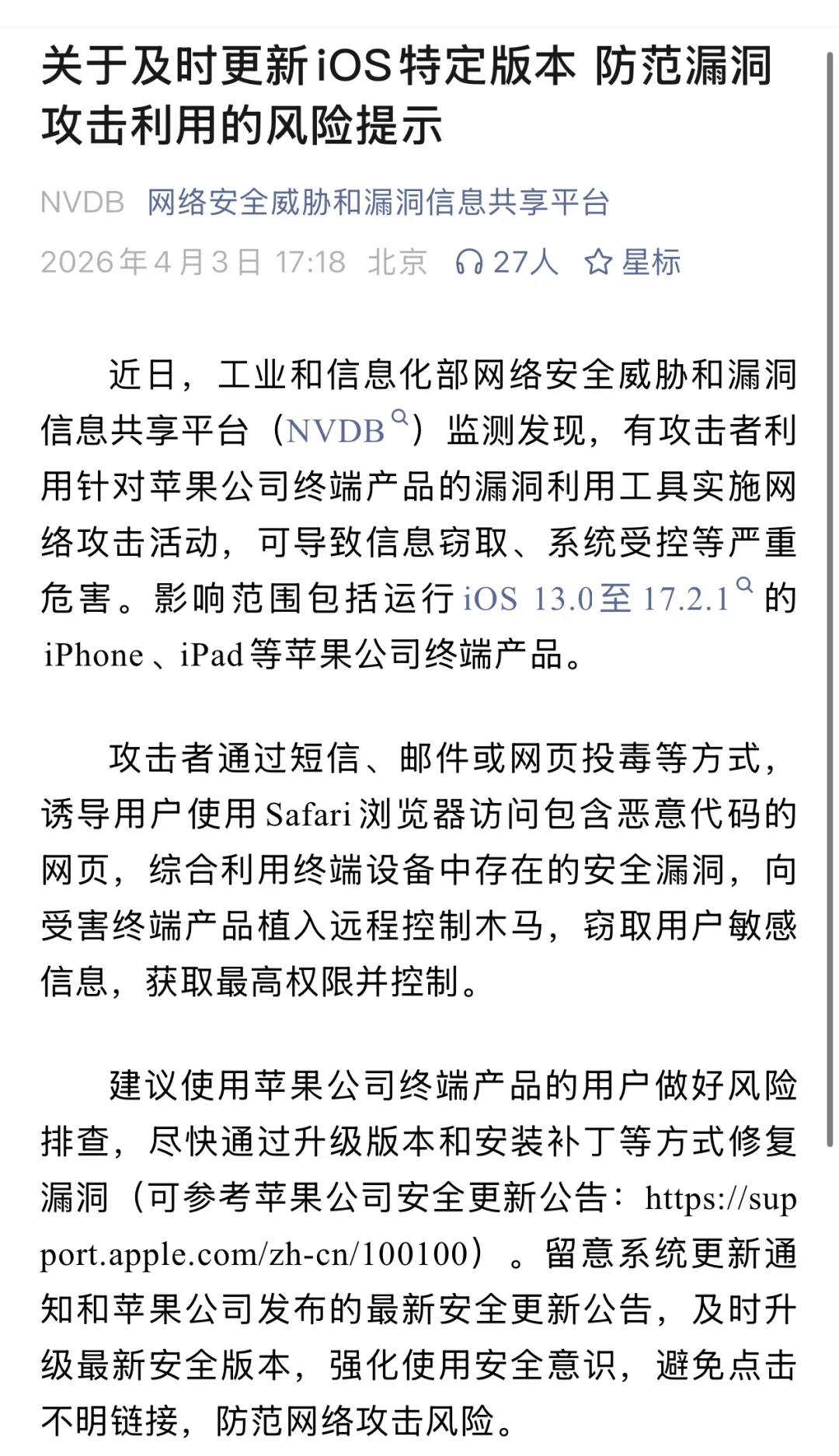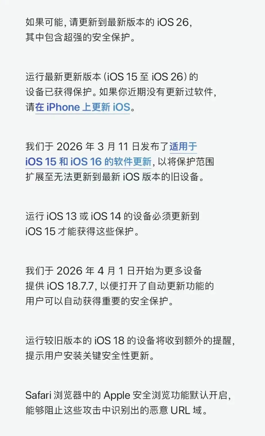 其实早在上个月底,苹果就已经开始行动了,一方面在官网的支持文档里明确标注了更新提醒,另一方面还直接给大家的苹果设备发送了系统弹窗通知,目的特别明确,就是为了保护咱们的iPhone、iPad不被网络攻击盯上,避免大家的设备出现安全隐患。