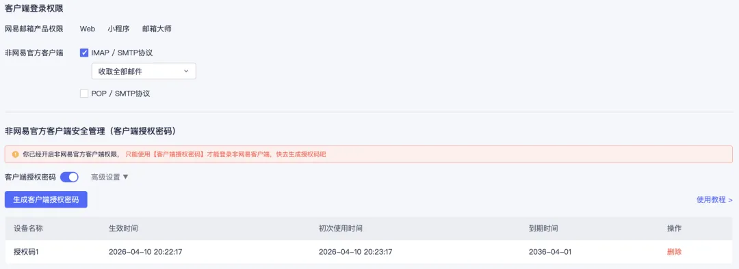 登录网易企业邮箱网页版 设置里找到客户端设置 开启 IMAP 服务(可参考下图) 点击「新增授权码」,生成一个专用授权码(只显示一次,立即保存)