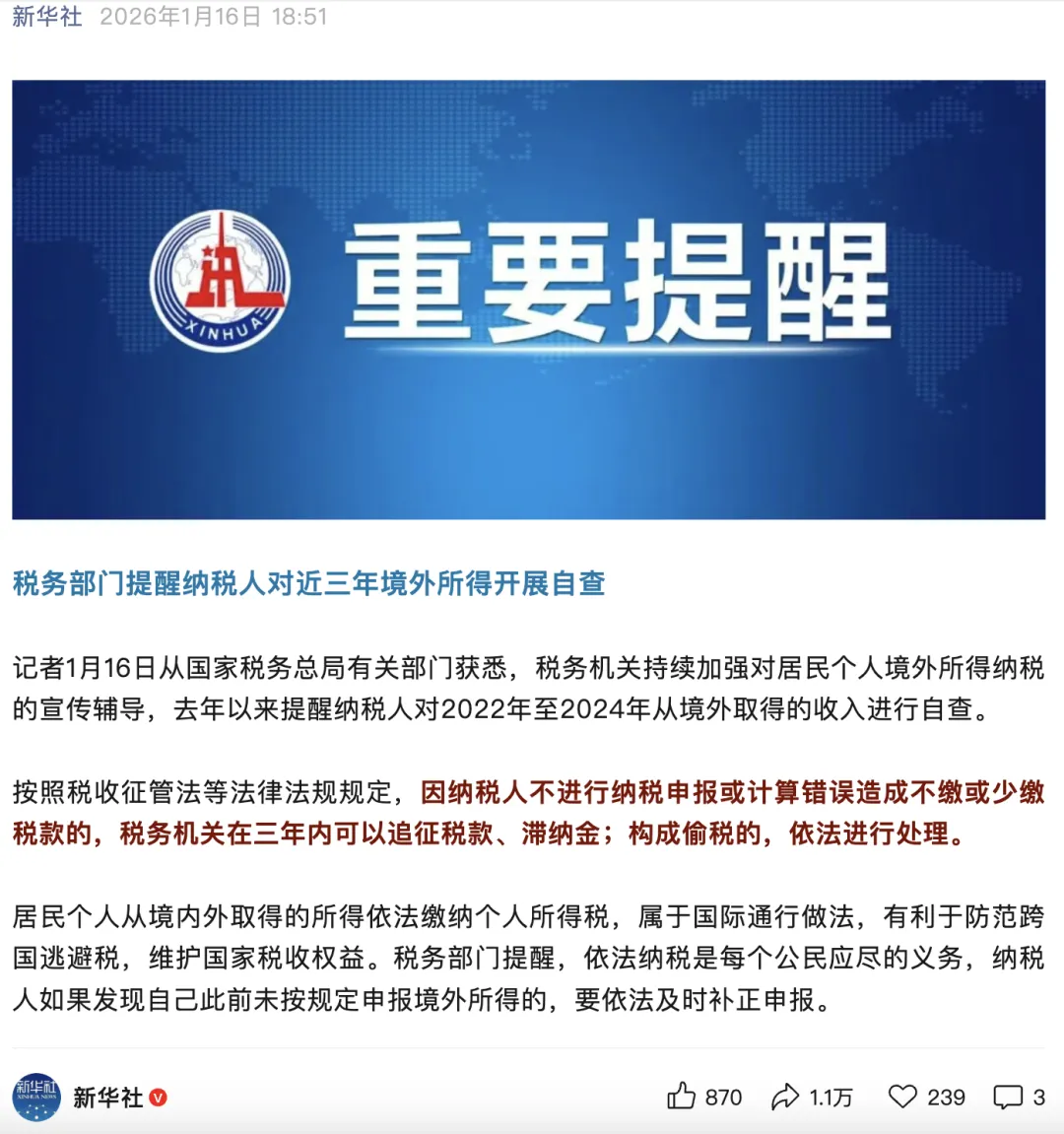 1月16日,新华社发布的一则关于“境外所得自查”的消息,引起了很多朋友的关注。