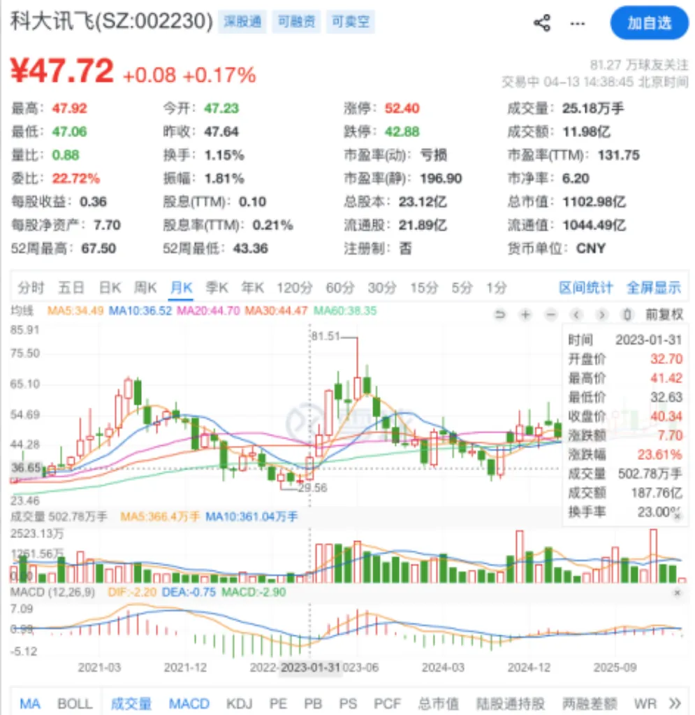 其实科大讯飞的掉队,从来不是意外,而是一场早有预兆的“泡沫破裂”。AI牛市初期,市场信奉“沾AI就涨”,科大讯飞靠着“中文语音AI先行者”的标签,被资本疯狂炒作,股价从32元一路飙升至81元的历史高点,市值直逼1900亿。