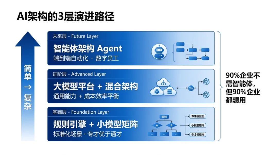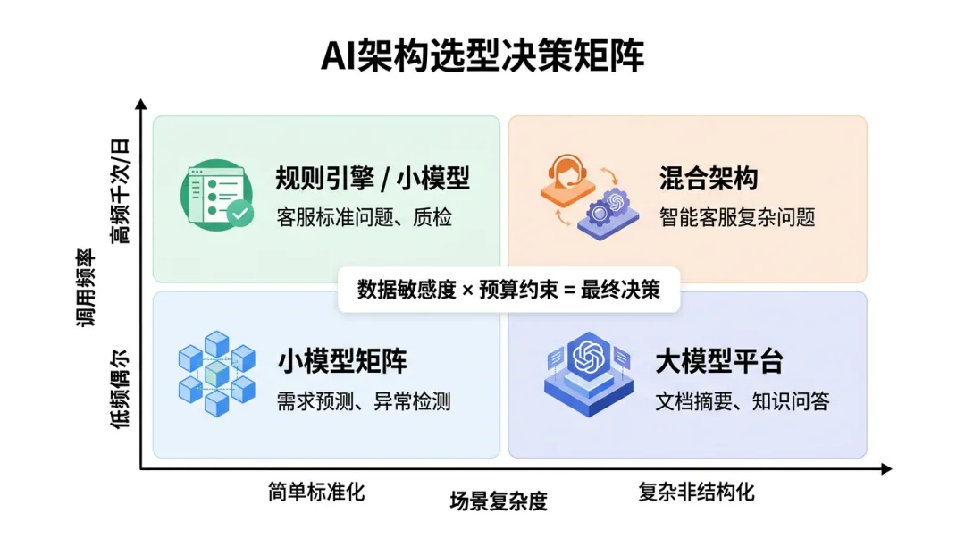 AI系统的5种核心架构:CEO必须知道的技术选型逻辑01 为什么技术架构选型是CEO的必修课?2024年初,某家电制造企业(年营收约80亿元)启动AI转型。CEO做了个决定:全部用大模型,所有场景都接入GPT级别的AI系统。18个月后复盘,问题暴露了:智能质检场景用的是视觉大模型,单次调用成本是传统小模型的5倍,一年光API调用费用就超了600万;客服场景用的是语言大模型,但70%的问题都是"订单查询""退换货政策"等标准化问题,用规则引擎就能解决,响应速度还快3倍。这不是技术选型失误,是架构决策失误。大模型不是万能的,小模型也不是落后的。真正的挑战是:不同的业务场景,需要不同的技术架构。根据我对42个企业AI项目的跟踪调研,架构选型错误的成本平均占项目总投入的35%-50%。这意味着一个1000万的AI项目,如果架构选错了,可能有350-500万是浪费的。技术架构选型不是CTO一个人的事,是CEO必须参与的战略性决策。今天我要拆解的是:AI系统到底有5种核心架构,每种适合什么场景,CEO应该如何做选型决策。02 AI架构的5种核心模式AI系统的架构选择,不是"大模型vs小模型"的二元对立,而是一个从简单到复杂、从通用到专用的光谱。我把它归纳为5种核心模式。但在此之前,我要先说一个反直觉的结论:90%的企业不需要智能体架构,但90%的企业都想用智能体。这是我在过去两年咨询工作中看到的最普遍的现象——CEO们被"Agent""Autonomous AI"这些概念吸引,想要一步到位上最"先进"的架构。但现实是,大多数企业连规则引擎都没用好,就要跳到智能体,这中间的跨度相当于还没学会走路就要跑马拉松。下面我们逐层拆解这5种架构,从基础到进阶,再到未来形态:基础层:规则引擎+小模型矩阵规则引擎是最基础的AI架构——不是机器学习,而是"如果...就..."的规则系统。听起来很低级?但我要告诉你一个事实:在客服场景中,规则引擎能解决70%的问题,而且响应速度比大模型快3倍,成本几乎为0。某家电企业的客服系统,日均处理咨询量2万+。他们上了一个大模型平台,年调用费用600万。但拆解一下数据会发现:70%的问题都是"订单查询""物流跟踪""退换货政策"这类标准化问题,用规则引擎就能解决。后来他们改造了架构:规则引擎处理标准问题(占70%),大模型只处理复杂问题(占30%),年成本从600万降到180万。小模型矩阵则是进阶一步——每个场景训练一个专用小模型:质检用一个模型、预测用一个模型、推荐用一个模型。它的核心优势是"专才优于通才"——针对特定任务优化,精度高、成本低、部署简单。但劣势也很明显:模型之间不互通,需要大量标注数据,场景变化需要重新训练。进阶层:大模型平台+混合架构大模型平台是2023年以来的主流选择——使用GPT、Claude、文心一言等大型基础模型,通过Prompt工程适配不同场景。它的优势是通用性强、开发快、持续进化。但我要提醒你注意一个隐藏成本:大模型的调用成本是小模型的5-10倍,对于高频场景(如每天上万次调用),这个成本会非常惊人。混合架构则是把大模型和小模型协同工作——大模型负责复杂推理和自然语言理解,小模型负责高频标准化任务。这是目前我看到的大多数成熟企业的选择。它兼顾了通用性和成本效率,响应速度分层优化,数据隐私也可控(敏感数据用小模型)。但架构复杂度增加,需要模型编排能力,运维成本也较高。未来层:智能体架构(Agent)智能体架构是AI的最高级形态——AI不是被动响应,而是主动执行多步骤任务:理解目标→拆解任务→调用工具→执行动作→反馈结果。这是AI从"辅助工具"升级为"数字员工"的关键一步。典型场景包括智能供应链(自动分析需求、预测库存、生成采购计划、触发审批流程)和智能运维(自动检测设备异常、诊断根因、生成维修工单、跟踪执行进度)。但我要再次强调:智能体架构技术复杂度高,需要完善的工具生态,安全可控性要求高,更重要的是——它需要组织变革来适配。如果你的企业连数据孤岛都没打通,流程还没标准化,上智能体只会是一场灾难。03 5种架构的选型决策框架3.1 选型的4个核心维度维度一:场景复杂度简单场景(标准化、重复性高)→ 规则引擎或小模型中等场景(有一定变化、需要判断)→ 小模型或大模型复杂场景(非结构化、需要推理)→ 大模型或智能体维度二:调用频率高频(每天上千次)→ 规则引擎或小模型(成本低、速度快)中频(每天几十到上百次)→ 大模型或小模型低频(偶尔使用)→ 大模型(按需调用,无需部署)维度三:数据敏感度高敏感(财务、人事、核心工艺)→ 小模型(本地部署,数据不出域)中敏感(客户信息、运营数据)→ 混合架构(敏感数据用小模型,非敏感用大模型)低敏感(公开信息、行业知识)→ 大模型平台维度四:预算约束预算有限(百万级)→ 规则引擎或小矩阵预算中等(数百万到千万级)→ 混合架构预算充足(千万级以上)→ 大模型平台或智能体架构3.2 实战案例:某物流企业的架构选型2024年初,某区域物流龙头企业(年营收约25亿元,日均处理订单5万+)启动AI转型。他们面临的场景有6个:智能客服、路线规划、需求预测、仓储分拣、异常检测、智能调度。如果用单一架构:全部用大模型,年调用成本预估超过800万;全部用小模型,开发周期需要12-18个月。最终他们选择了混合架构,按场景拆分:规则引擎(2个场景):• 智能客服中的标准问题(订单查询、物流跟踪、退换货政策