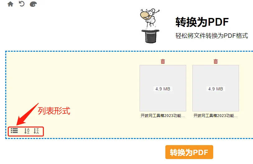 将需要转化的文件拖入黄色区域内(默认列表为:大图标,点击左下角切换列表形式)