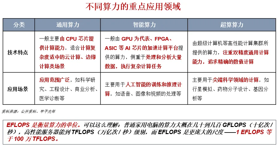 全球算力主要分为三类:通用算力负责日常基础运算,智能算力专攻 AI 相关复杂任务,超算算力则用于气象、基因等高端科研场景。