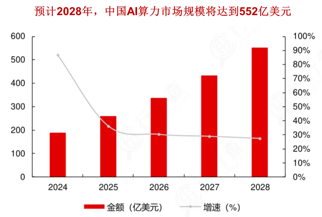 中国 AI 算力市场预计 2028 年规模达 552 亿美元,2024-2028 年将从 200 亿美元增长至超 500 亿美元,增速呈 “先高后稳”:2024-2025 年增速超 50%,之后回落至 20%-30% 区间,行业正从爆发期走向成熟扩张阶段。