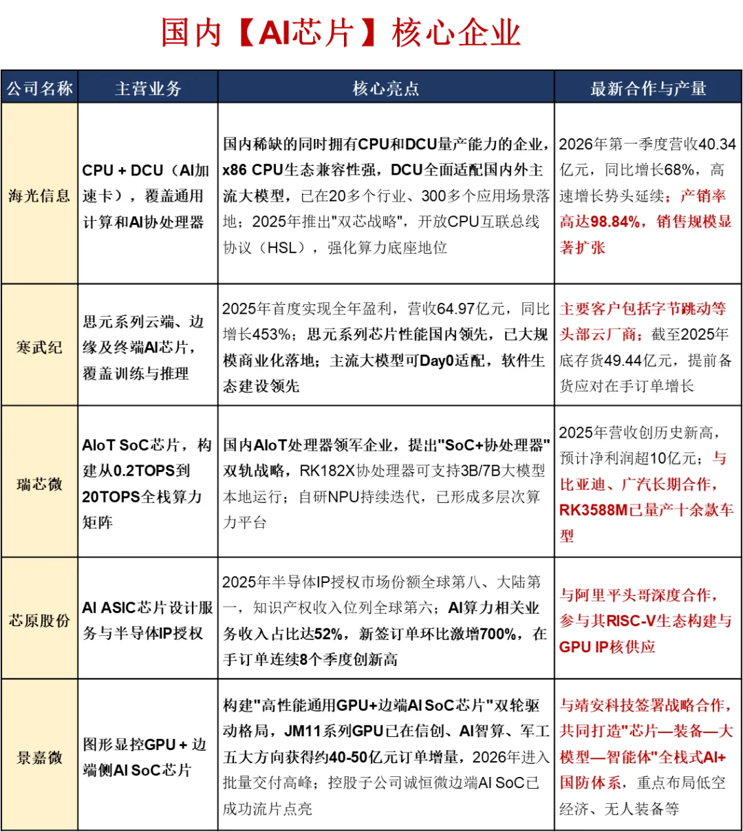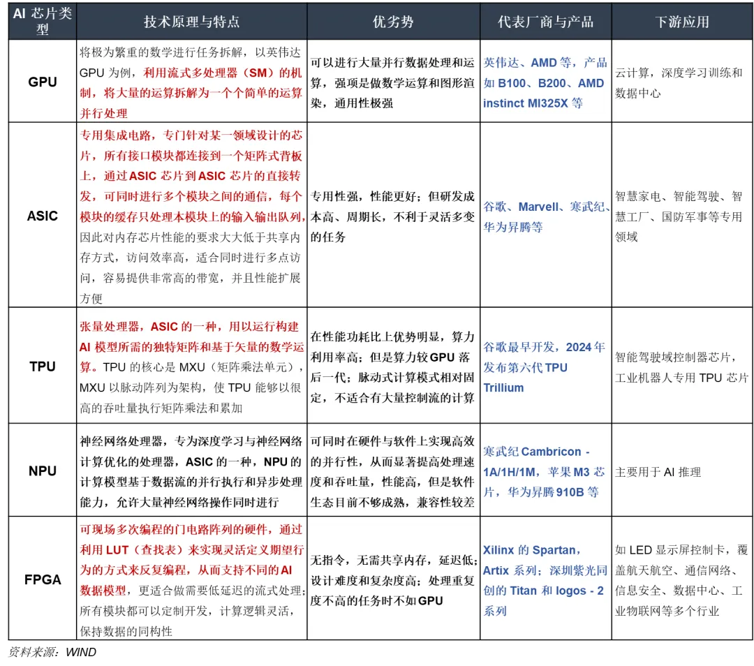 ASIC:专为特定场景设计,效率和性能最高,但开发成本高、周期长,典型产品包括谷歌 TPU、寒武纪和华为昇腾的 NPU。