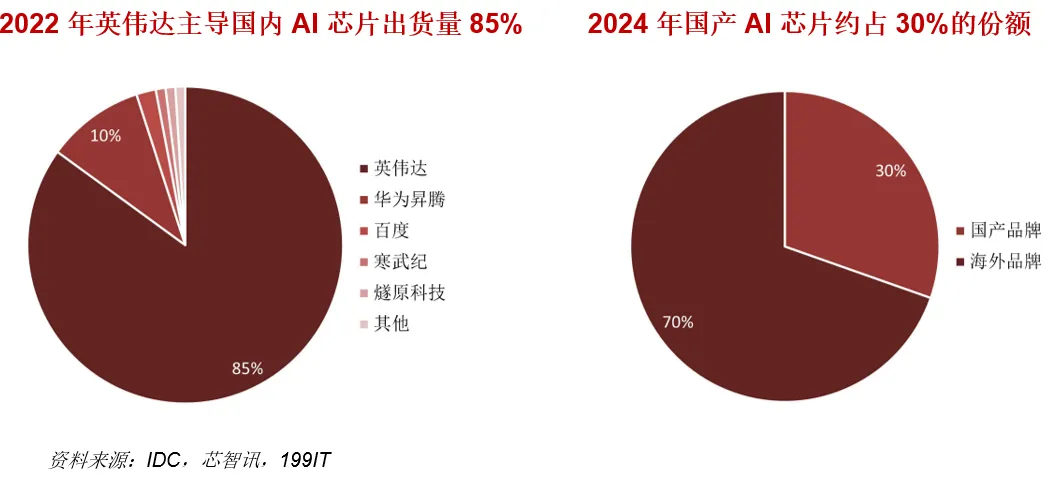 到 2024 年,国内加速芯片出货量增至 270 万张,国产份额提升至约 30%,但与英伟达的统治地位相比,仍处于追赶阶段。