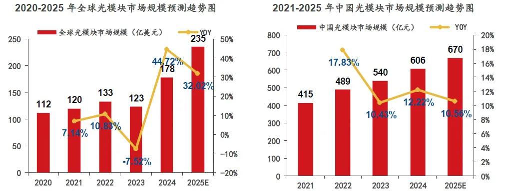 在数据中心、云计算,尤其是 AI 算力需求的推动下,全球及中国光模块市场均保持强劲增长,数通市场与超高速产品成为核心增量来源。