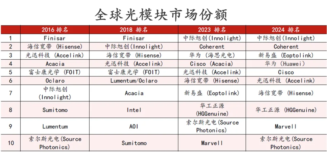 中国企业已主导全球光模块制造与封装,2024 年全球前十供应商中中国厂商占七席。