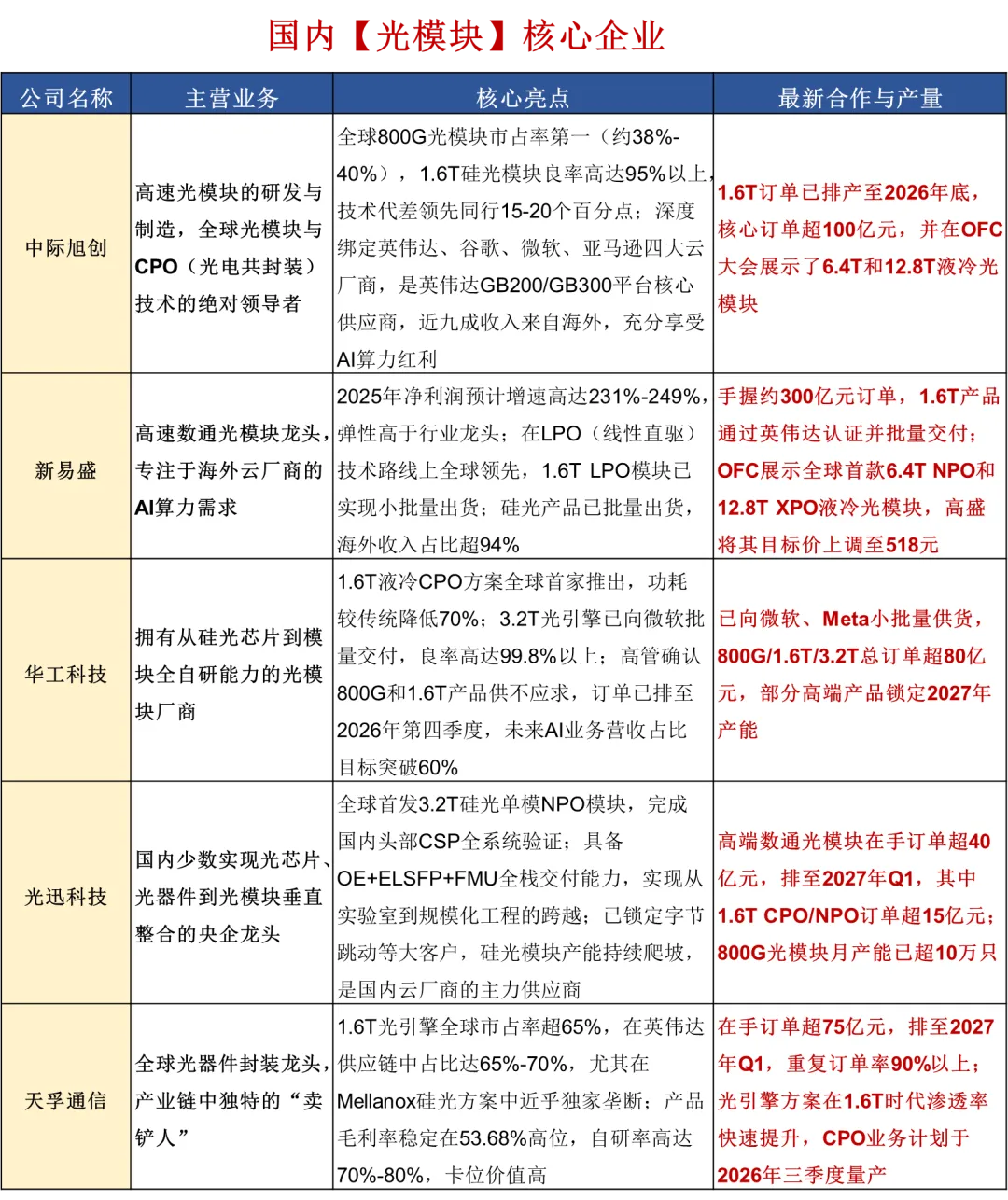 中际旭创在 400G/800G 领域领跑并服务全球巨头,光迅科技、新易盛及华工正源、海信宽带等亦在各自赛道具备全球与国内核心竞争力。