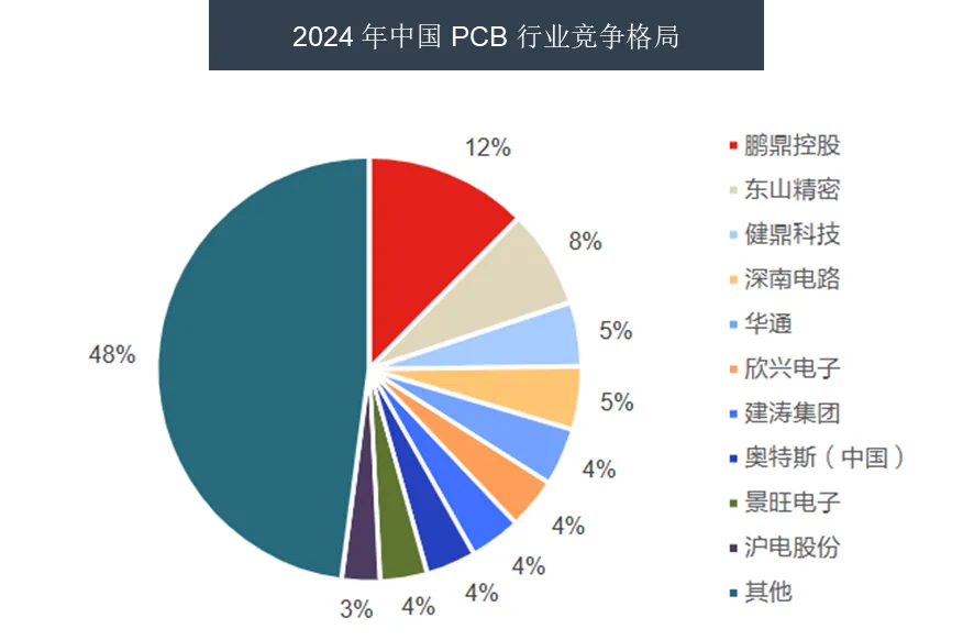 PCB 行业呈现分散竞争格局,头部企业难以形成垄断。2021 年全球 PCB 行业前十企业市占率合计仅 36%,龙头鹏鼎控股份额约 7%;2024 年国内前五企业市占率合计也仅 34%。