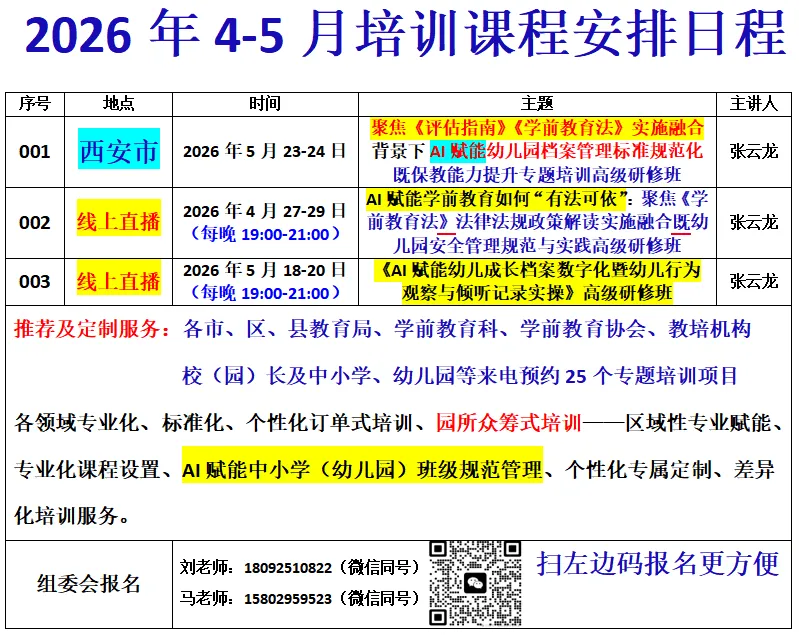 为了帮助园所更全面充分地理解新法、执行新法,为此,本单位特定于【线上直播】2026年4月27-29日(共三场:每晚19:00-21:00)举办.AI赋能聚焦《学前教育法》政策解读与实施标准暨幼儿园安全管理儿童意外伤害事故处理指导与防范高级研修班”由全国29个省269市教育部国培、省培幼教专家-张云龙老师亲临直播间主讲!机会不容错过!