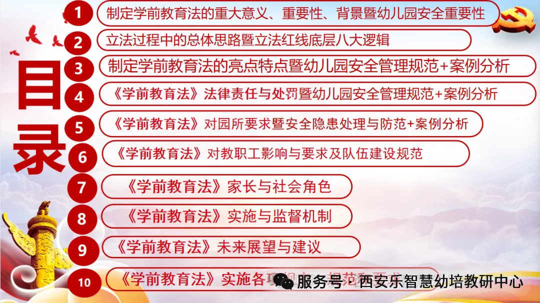4月28日 (星期二) 第二讲 (19:00-21:00) | 五、《学前教育法》对促进学前教育普及普惠发展有哪些规定 六、《学前教育法》对保障学前儿童权益有哪些规定七、《学前教育法》对幼儿园规范和举办具体要求有哪些?1 AI赋能聚焦《学前教育法》背景下幼儿园安全责任风险现状分析和对策 八、《学前教育法》出台后,民办幼儿园应当规避的问题和策略 | 张云龙 |