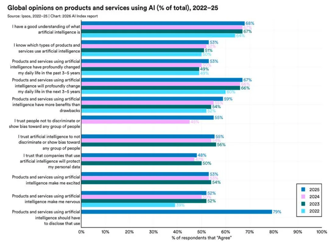 专家普遍更乐观,而公众更倾向于悲观和焦虑在几乎所有受访的社会议题中,AI专家都比公众表现出显著更高的乐观情绪。除了工作方式,双方在其他关键领域的判断也存在类似量级的鸿沟:在对经济的影响方面,69%的专家持积极态度,而公众仅为21%;在医疗保健方面,84%的专家看好AI的积极作用,公众的比例则只有44%。