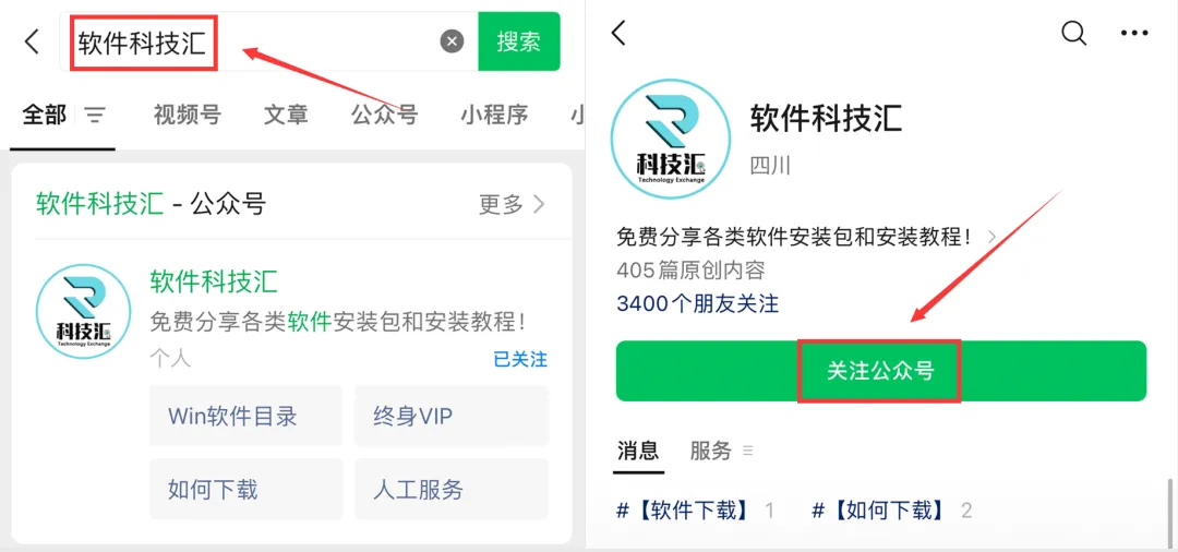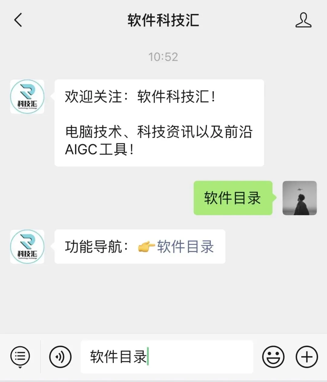 在软件科技汇公众号对话框发送软件名称或在软件目录中查找。