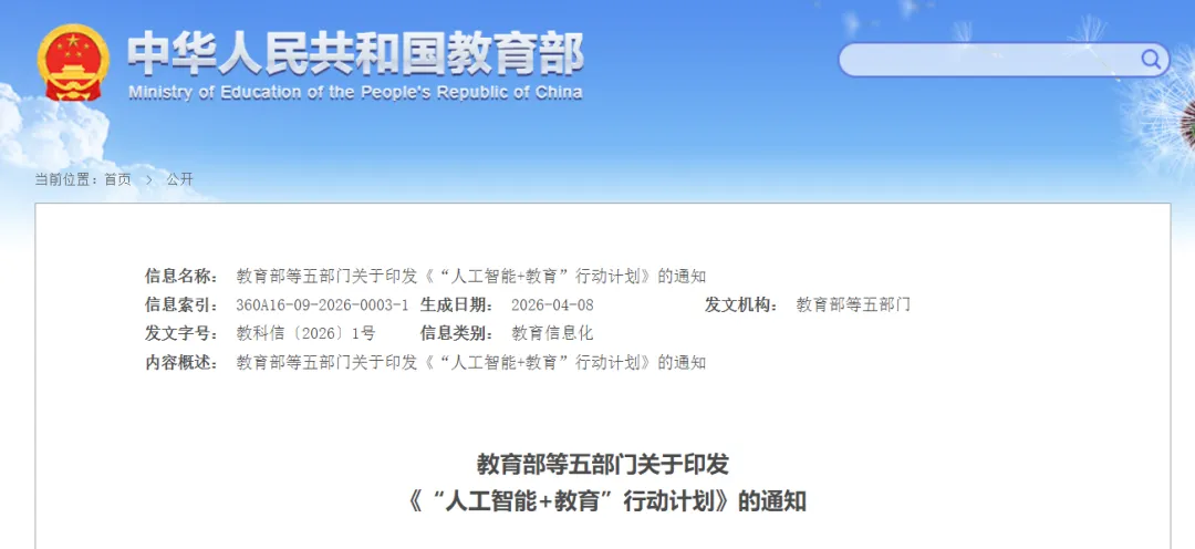 2026年4月8日,教育部等五部门关于印发《“人工智能+教育”行动计划》通知,明确提出要推动人工智能与教育教学深度融合,破解传统教学中的痛点难点。