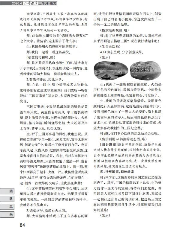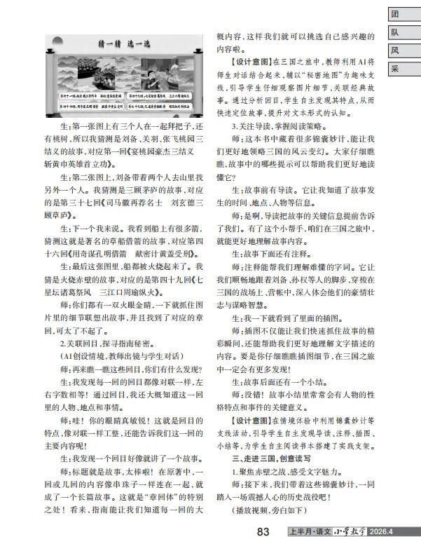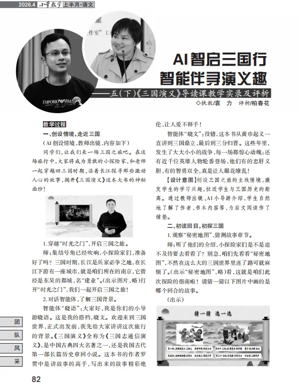 袁力老师发表于《小学教学》的《AI智启三国行》一文,用一节《三国演义》导读课,为我们完整示范了AI如何成为小学语文教师的“教学利器”。今天,长辫子老师就从这篇优秀课例出发,拆解出9项可直接落地的AI“硬技术”,真正实现有趣、有料、有效。