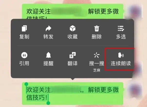 在微信聊天界面长按任意消息,弹出的操作菜单里,原来的“从当前听”变成了“连续朗读”。