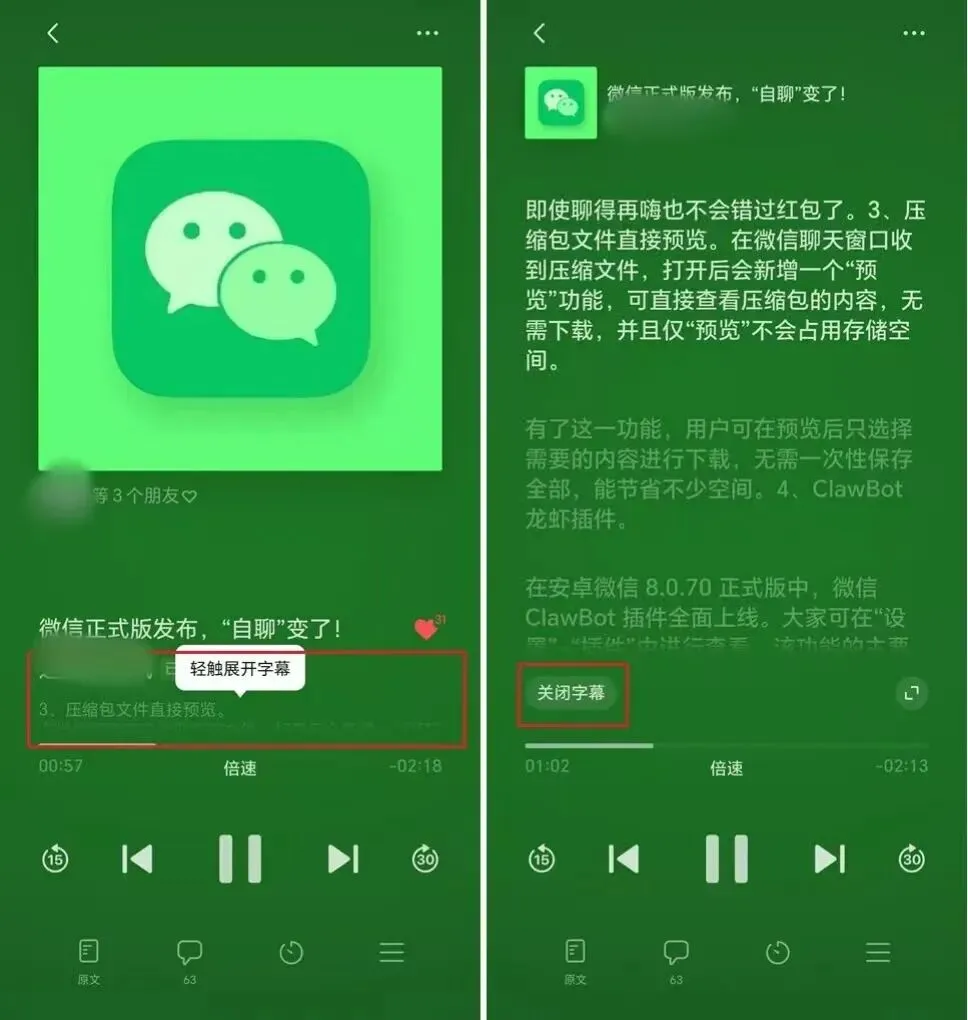 在iOS微信8.0.71正式版中,公众号文章“听全文”播放器实现了升级。进入播放器页面后,公众号名称下方新增了“字幕”显示,轻触即可展开字幕,以大字形式查看文字,还能上下滑动,也能“关闭字幕”。