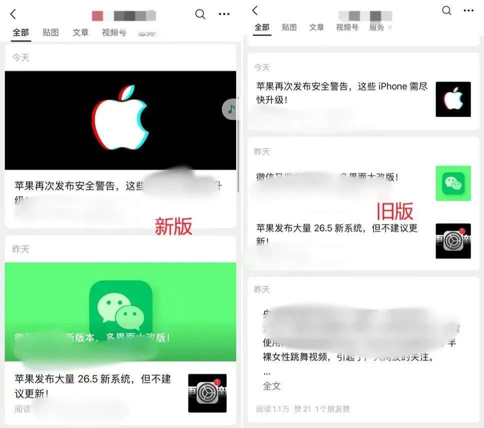 在iOS微信8.0.71正式版中,微信再次对公众号主页文章显示做了调整。公众号头条文章封面改成了完整的大图显示,和公众号信息流页面保持一致;而之前所有文章封面都是缩略小图,头条和次条在视觉上区分不明显。