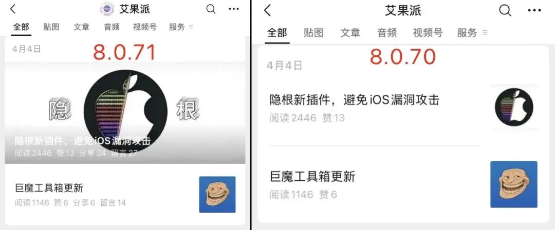 ❹微信“我”→“视频号与公众号”变成“作品”(还未完全覆盖)