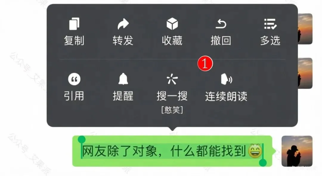 ❶连续朗读:长按消息菜单中的“从当前听”更名为“连续朗读”,优化了长句朗读的流畅度。(未完全覆盖)